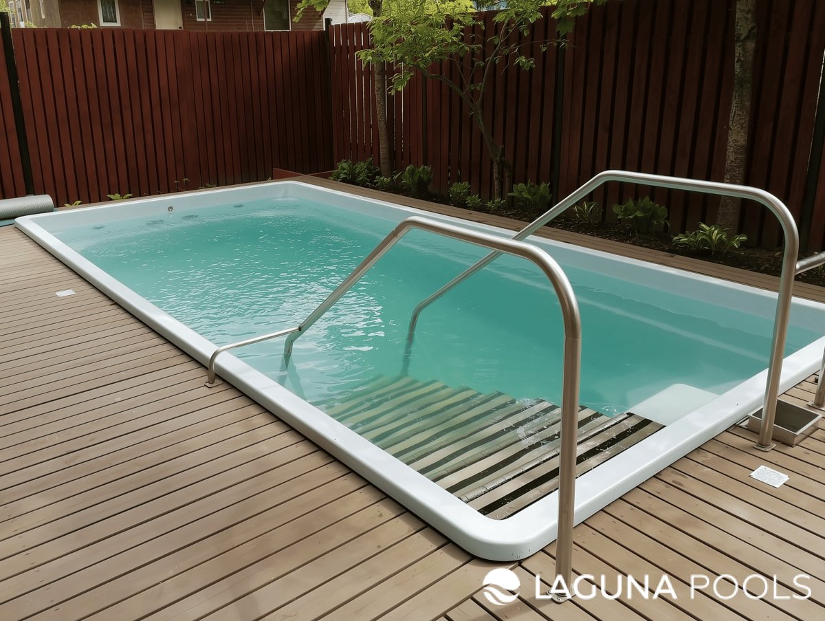 Прямоугольный композитный бассейн с деревянной террасой