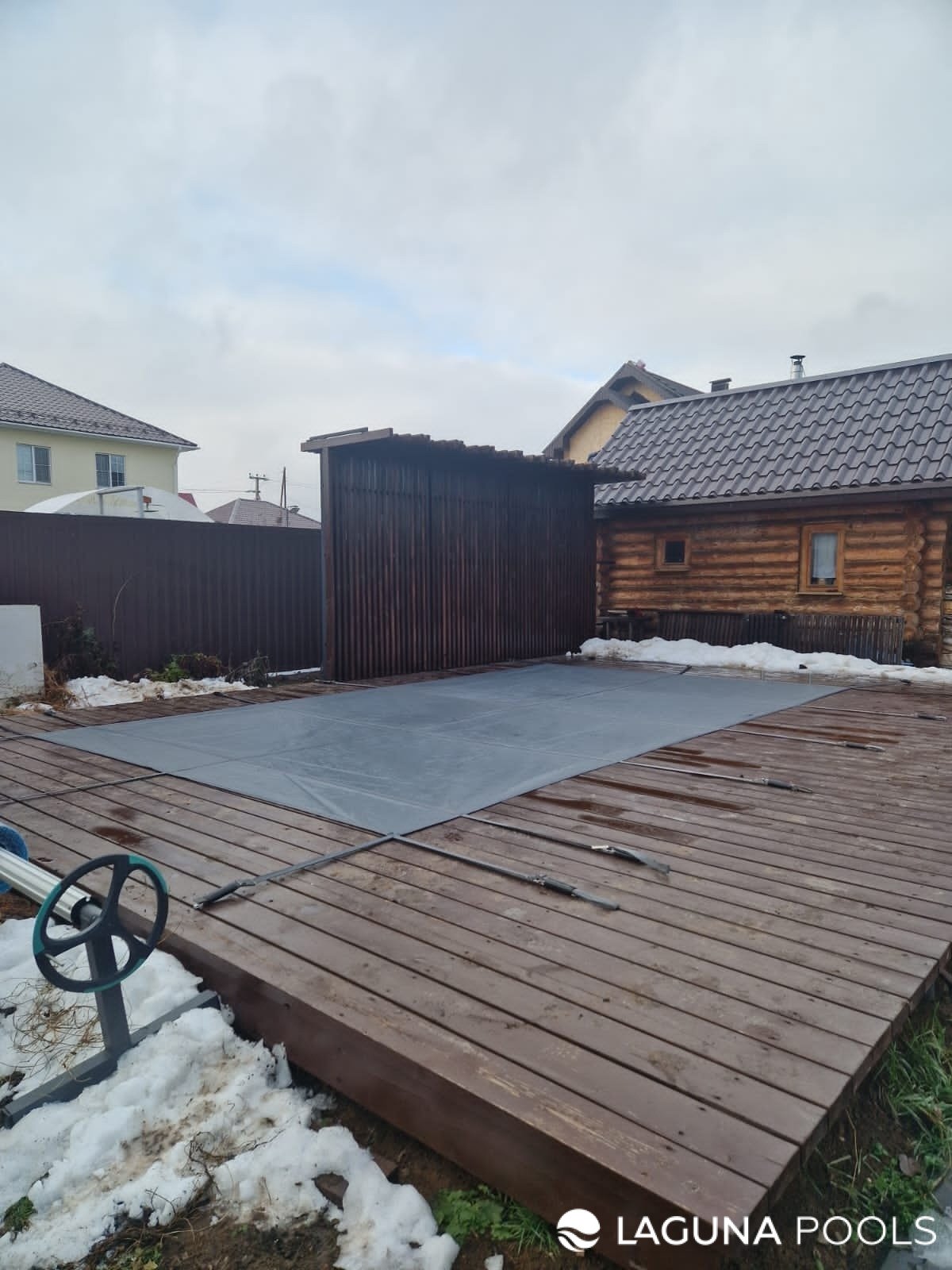 Композитный бассейн с серым защитным тентом установлен на террасе из темного дерева рядом с деревянным срубом.